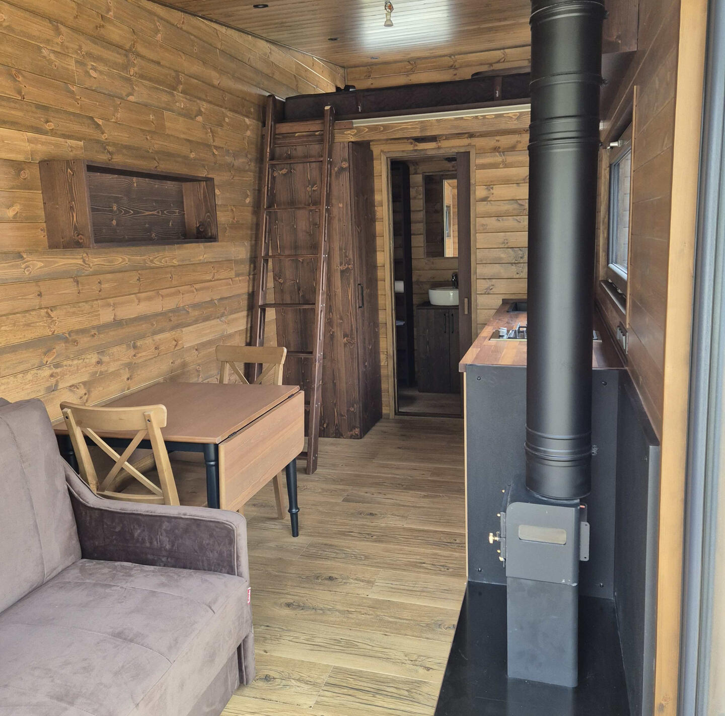 Yes, it is a tiny house.The inside space is minimalistic and optimized for those things that we really need.The house is fully equipped with a kitchen, stove, oven, fridge, cold and hot water, toilet, shower, comfy bed, and heating via a rustic wood oven.The Viking-style interior is complemented by the mind-blowing nature that surrounds our house with vast views. Everything promotes an active lifestyle.